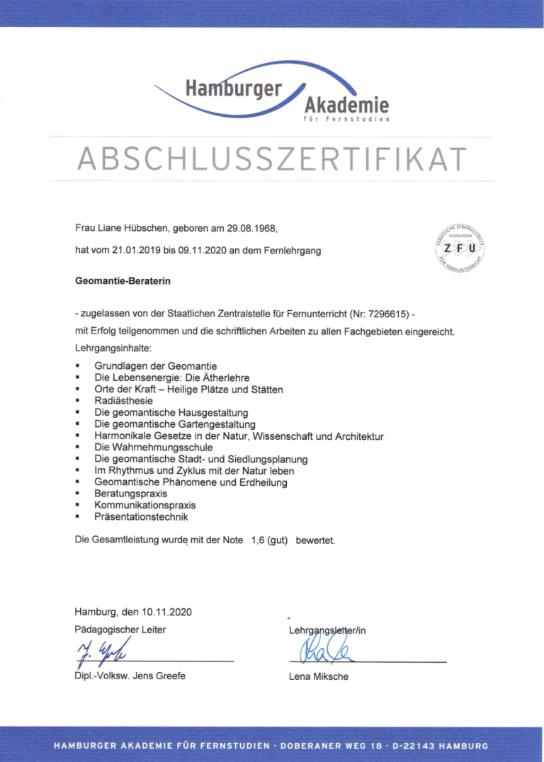 2019 suchte ich eine weitere Herausforderung und startete in das für mich total spannende GEOMANTIE Studium, welches ich Ende 2020 als zugelassene Geomantie-Beraterin erfolgreich abgeschlossen habe.
