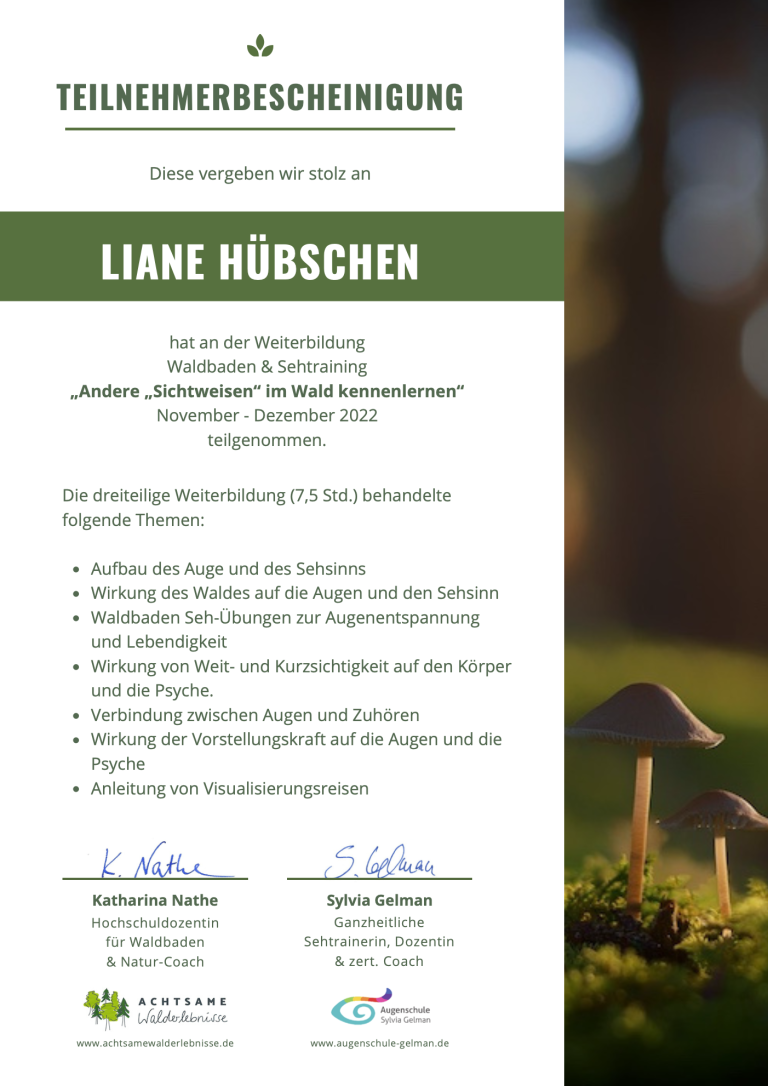 Waldbaden & Sehtraining „Andere „Sichtweisen“ im Wald kennenlernen“; was sich dahinter wohl verbirgt, fragte ich mich und nahm 2022 an dieser Weiterbildung teil.